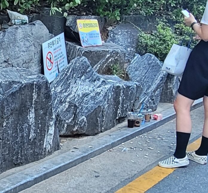 20대 여성이 담배를 피우고 있었다. 주변은 당국의 지도와 감시를 피해 버린 커피용 일회용컵과 우유팩 등이 버려져 있었다.